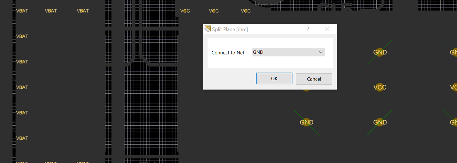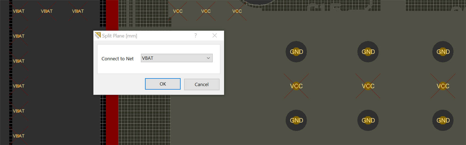 I am designing a 4 layer board - SIgnal1,GND,Vcc and Sig2. In the VCC layer I have 2 planes viz - VBAT and VCC. I have given the split using the line "L" command and drawing a 1mm thick line. The planes seem isolated and look good. Kindly refer the image below. The layer is Internal Plane 2.