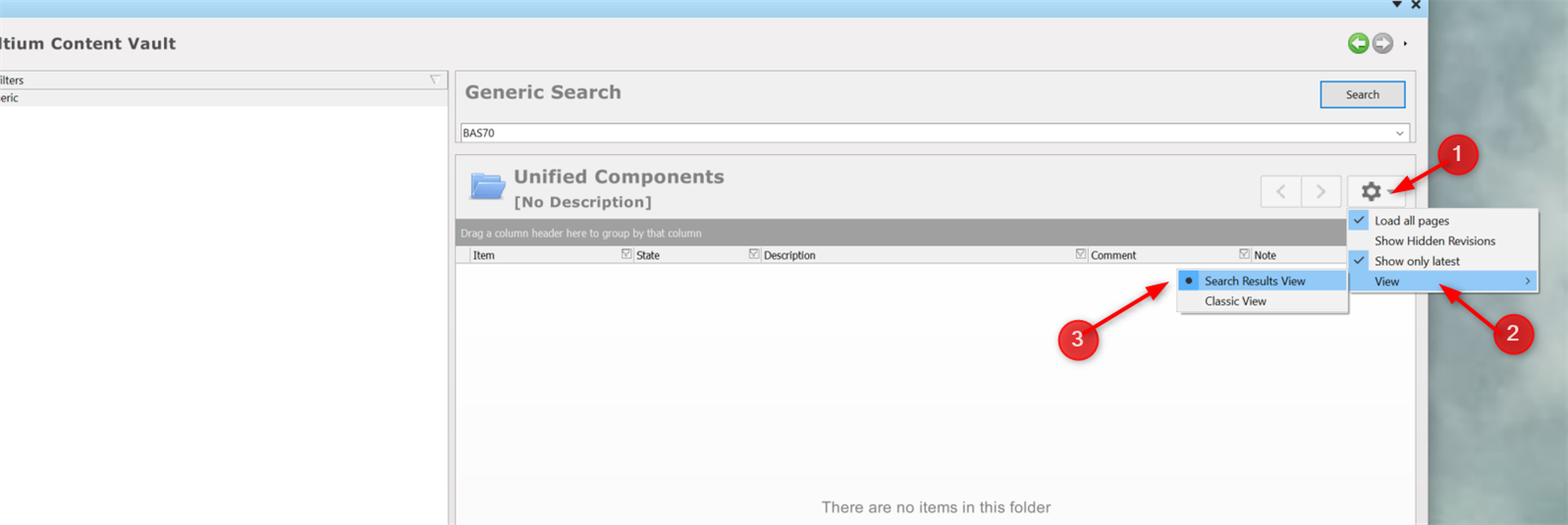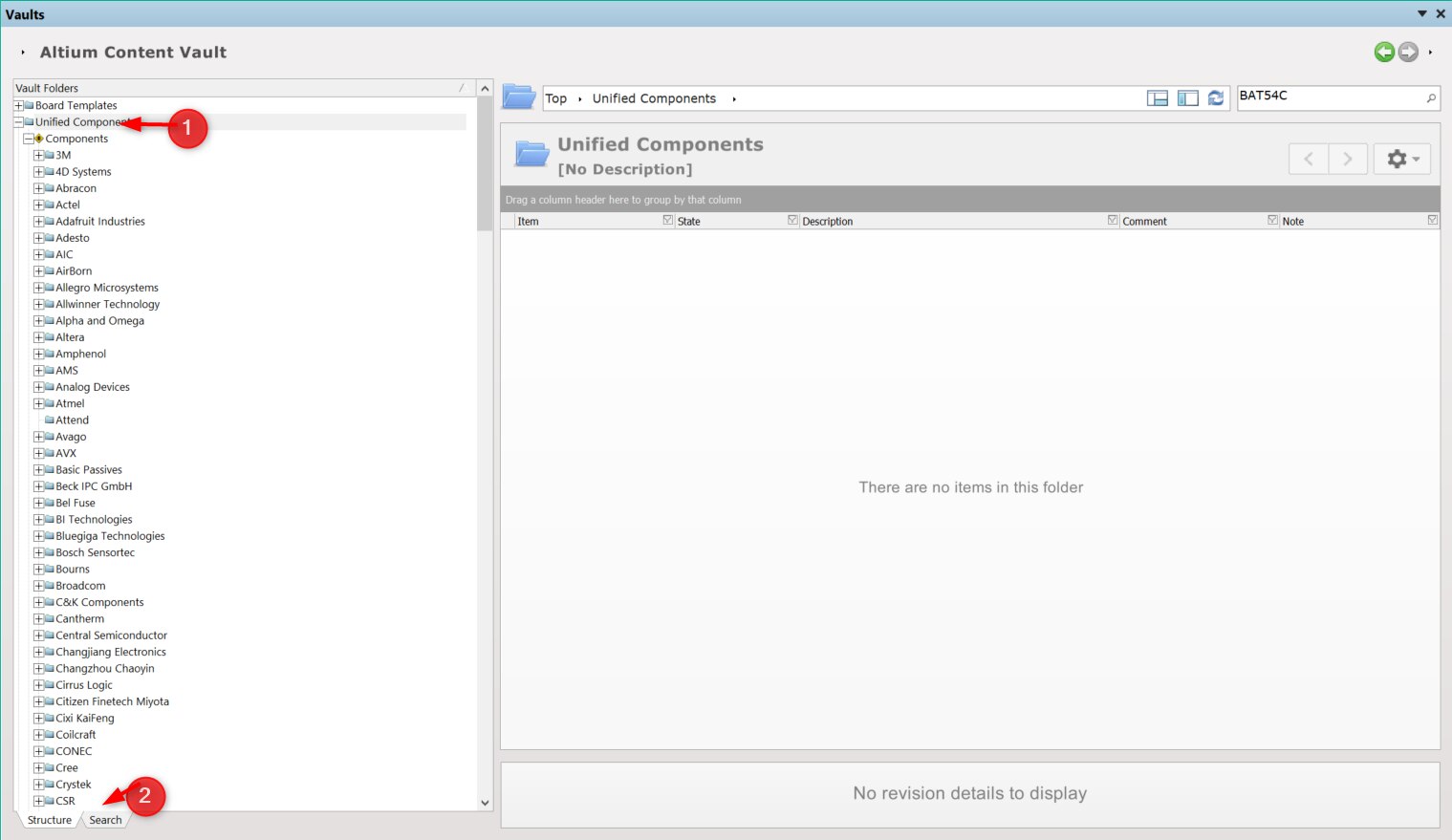 First start in the Vault page; here it is at the Structure tab. If you do a failed search it goes to a search results view on the right-hand side with the offending message. For example; I search on BAT54C and get the error.