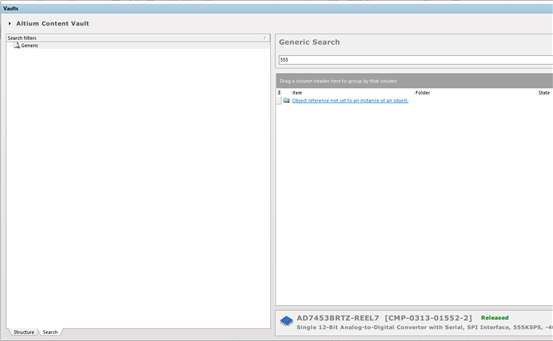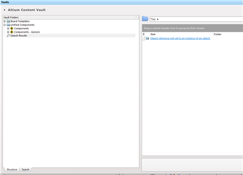 I then Re - added Altium Content Vault. The regular vault search still has the Object reference error.