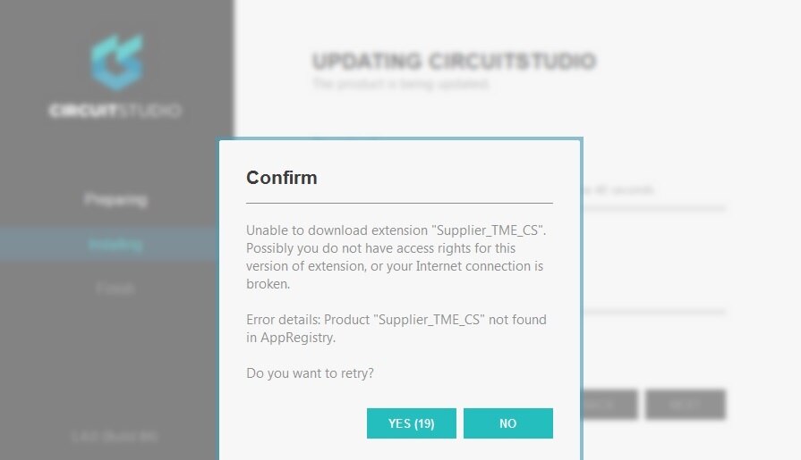 Because of BSoD problems with CircuitStudio on Windows 10 Pro ('Creators Update', see here, here, and here) I decided to boot up an old partition of Windows 7 and see if I couldn't get that running, but it was a 1.0 release. I was able to get up to 1.2.0 before I again started having problems. This time there seems to be a problem accessing and downloading a supplier plug-in because I can't get past the following error: