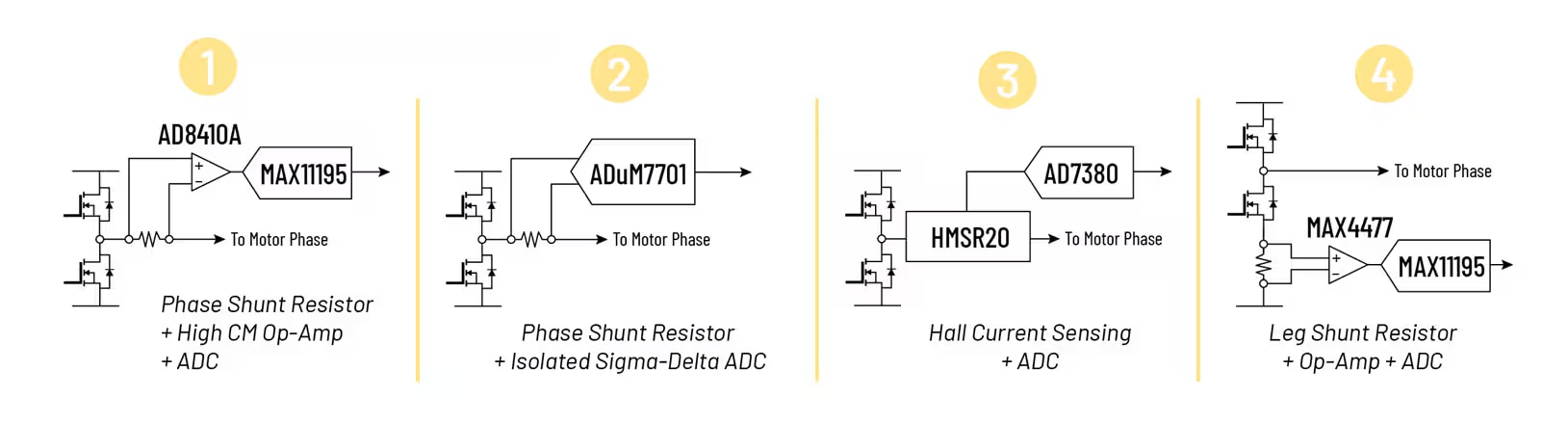 Series shunt resistor + high common mode voltage (CMV) op-amp + simultaneous sampling ADC (SSADC) |