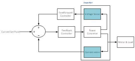 While current feedback is the most important feedback variable from the inverter to the controller, DC bus voltage can also be valuable as a control feedforward variable. It is not used as a controlled quantity, but because variation in the DC bus voltage impacts the dynamics of the current control loop it can be used as a feedforward variable, which improves the dynamics of the overall current controller. The end result of this is as shown in Figure 4.