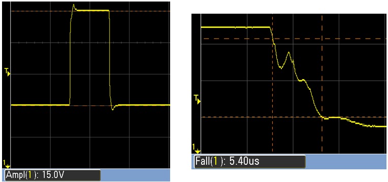 Using the implemented AVR solution I created the below example 15 V 1 ms transient pulse on a 10 VDC level. The first scope shot shows the whole pulse and the second shows the rise time. Both rise and fall times were less than 6 us.