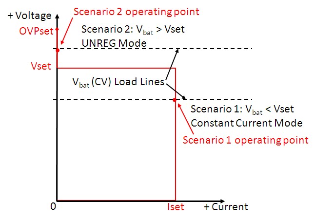 However, with active load devices you have a pretty high chance of encountering UNREG mode operation, depending where the actual voltage and current values end up at in comparison to the power supply’s voltage and current settings. One common application where UNREG can be easily encountered is charging a battery (our external active load device) with a power supply. Two different scenarios are depicted in Figure 2. For scenario 1, when the battery voltage is less than the power supply’s output, the point where the power supply’s IV characteristic curve and the battery’s load line (a CV characteristic) intersect, the power supply is in CC mode, happily supplying a regulated charge current into the battery. However, for scenario 2 the battery’s voltage is greater than the power supply’s CV setting (for example, you have your automobile battery charger set to 6 volts when you connect it to a 12 volt battery). Providing the power supply is not able to sink current the battery forces the power supply’s output voltage up along the graph’s voltage axis to the battery’s voltage level. Operating along this whole range of voltage greater than the power supply’s output voltage setting puts the power supply into its UNREG mode of operation.