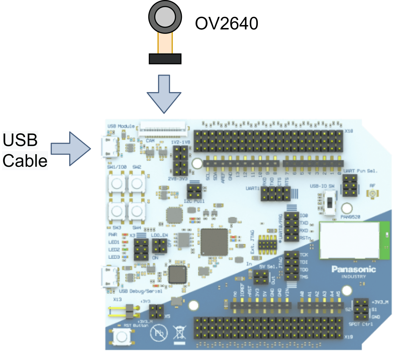 The PAN9520 ETU contains a 24-pin FPC connector for operating a camera module via an 8-bit parallel camera interface and SCCB (Serial Camera Control Bus). Connect the camera like shown in the picture. Please make sure that the lens is turned towards you so that the pinning is the right way round. As soon as the camera and Evaluation Board are connected, plug in a micro USB cable in the “USB Module” Interface.