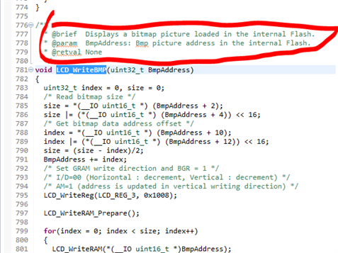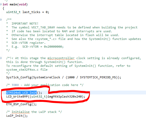 LCD_WriteBMP((uint32_t)imgMtkSplash320x240) Displays a bitmap picture loaded in the internal Flash.