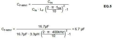 The result of EQ.5 may be negative – this would indicate that with the chosen inductor value it is not possible to attain a filter resonance frequency ten times lower than the switching frequency. The inductor value can be increased if desired, though this comes at a penalty of lower efficiency and/or a larger inductor due to the higher DCR and higher core losses that accompany higher inductance. Setting resonant frequency ten times below switching frequency is a guideline, not a hard limit.