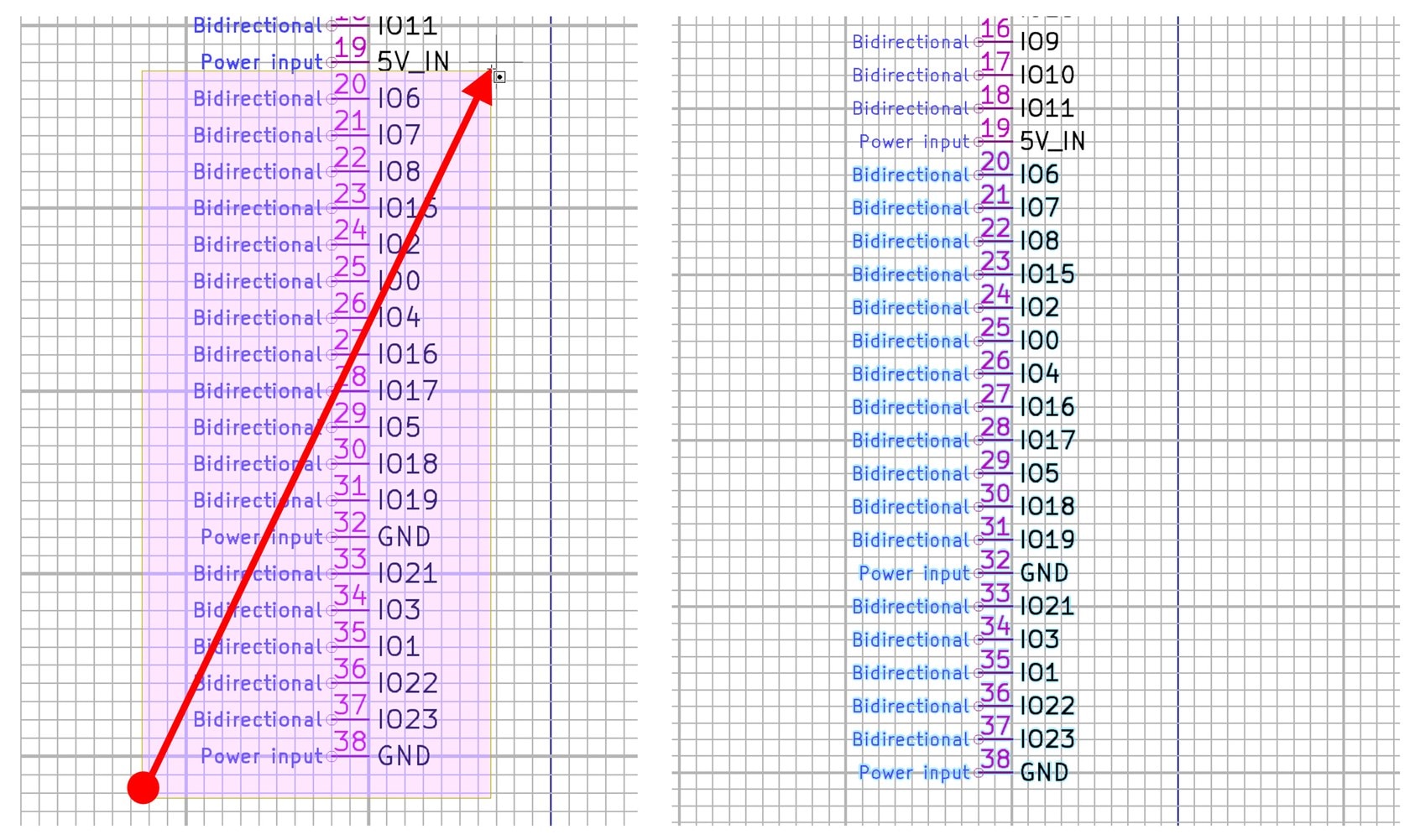 Click and drag to draw a shaded pink box around the pins you wish to move. We know the symbol has 19 pins on each side, so I want to move pins 20 to 38 in this example. When you have drawn the pink shaded box, release the mouse button, and you’ll see the selected items have a blue glow around them.