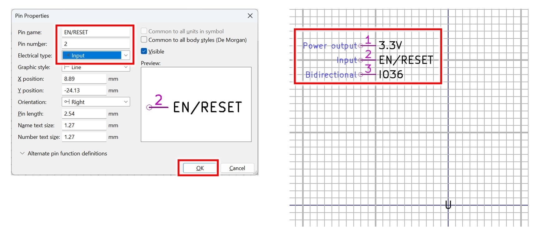 Double-click on the new symbol name you just created to make sure it is selected. Then, click in the canvas area and type ‘P’ to add a pin. From the earlier diagram, you know that pin 1 is a 3.3V power output pin, so that’s what you need to populate in the Pin Properties window, then press OK.