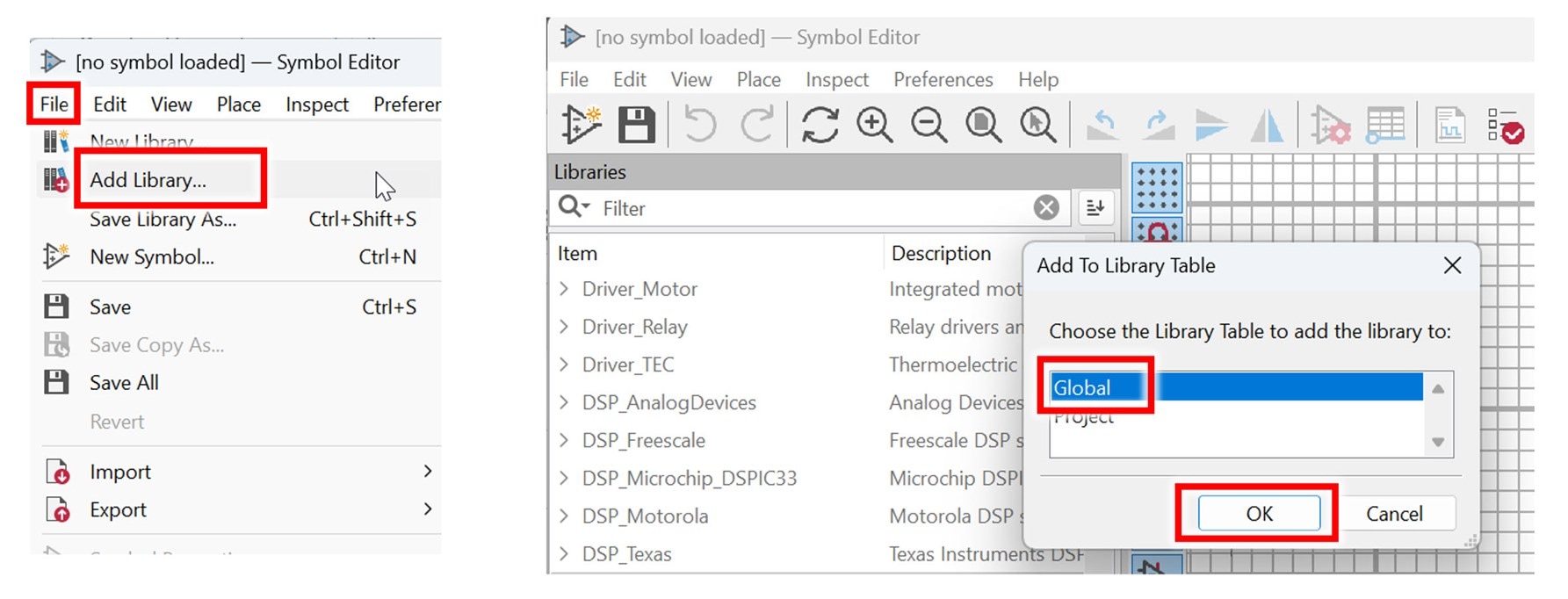 I’ve zipped up and placed the ESP32 symbol library as an attachment to this blog post further below. If you wish to use it, unzip it, and place it at the location mentioned ( C:\Users\your_user_name\Documents\KiCad\version_number\symbols ) and then within the Symbol Editor, click on File -> Add Library, then select Global, then select the file.