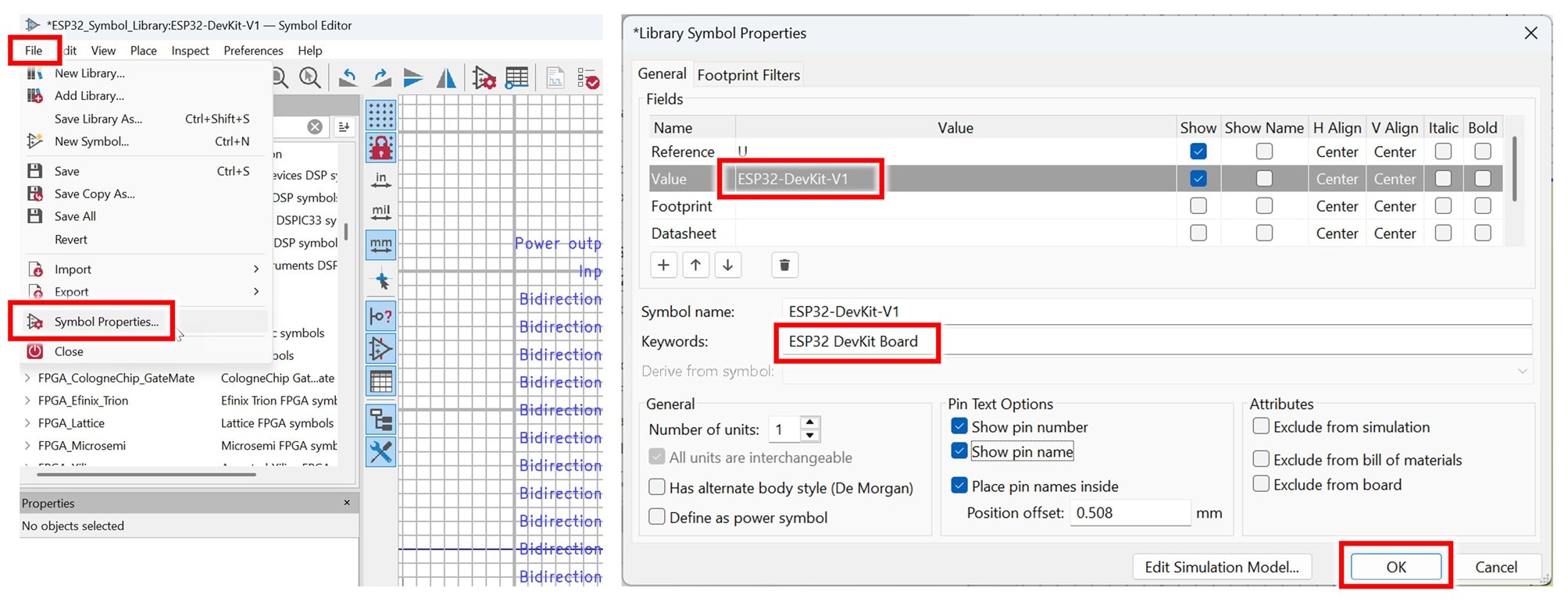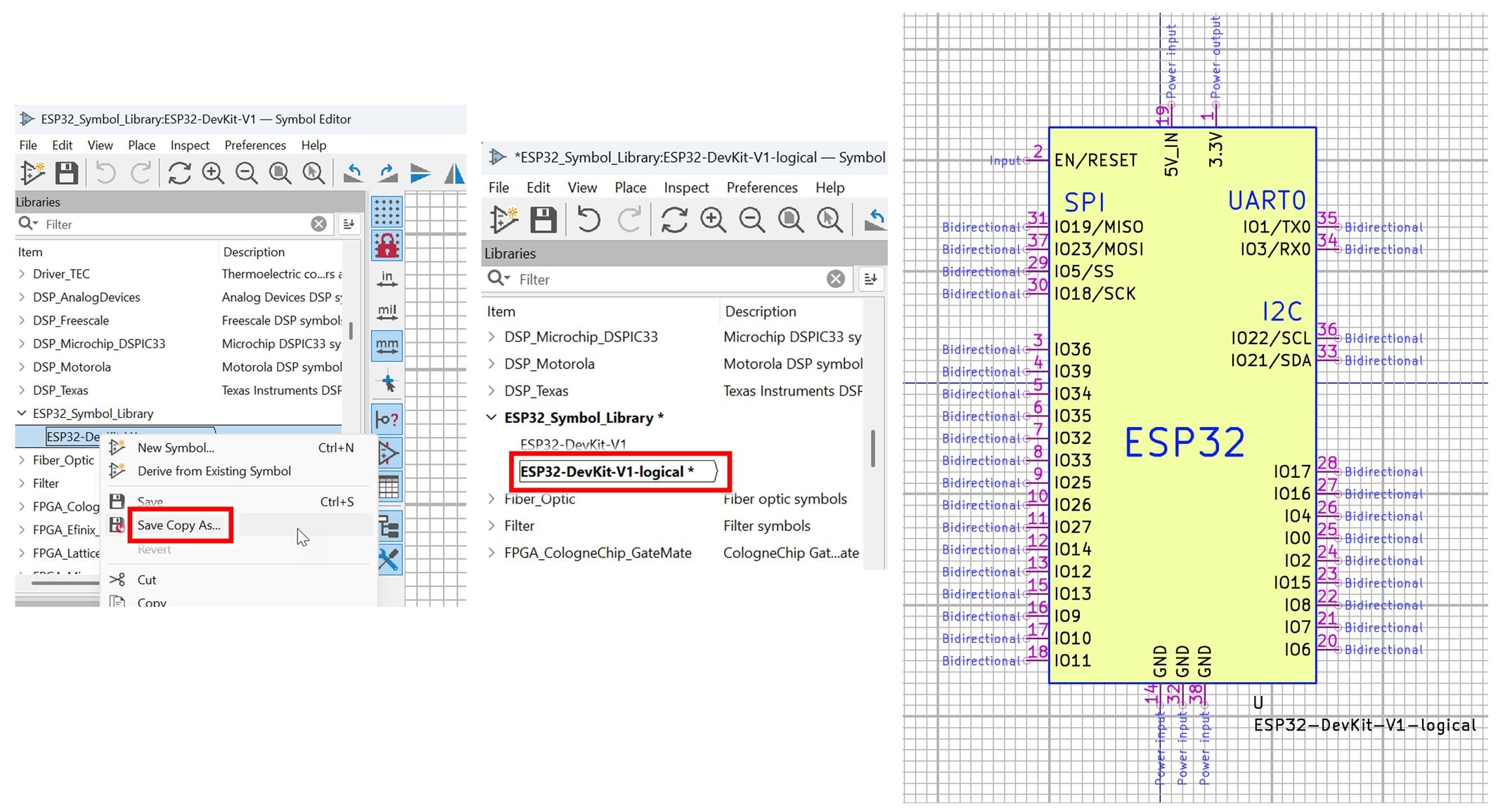 To do that, right-click on your symbol in the left-side pane in the Symbol Editor, and select Save Copy As. Type a name such as ESP32-DevKit-V1-logical.