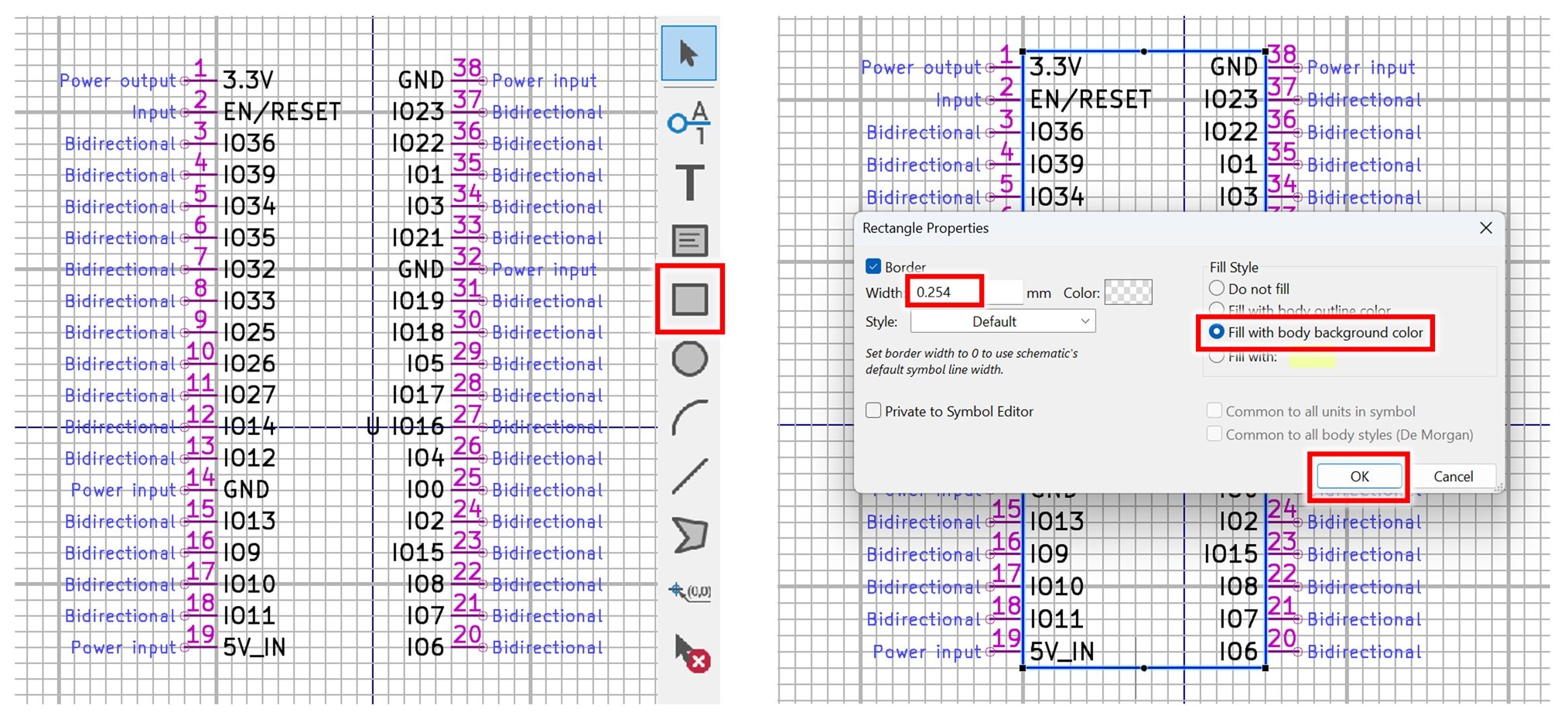 It’s now going to look more like a symbol! Click on the rectangle icon on the right-side palette, then click once at the top-left where you want one corner, and then click once at the desired bottom-right location, and a rectangular shape will be drawn in blue. Hit the Escape key to exit the rectangular box creation mode. Then, double-click on the box you’ve just drawn, and a properties window will appear. Type 0.254 for the width (this is the standard width for KiCad style component symbol outlines) and then select that you wish the box to be filled with the standard background color for symbols. Then click OK.