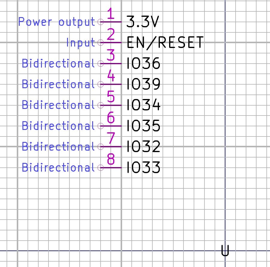 Now you could move pins around, and, for instance, place all the GND pins at the bottom of the symbol (use the M and R keys to move and rotate), and the supply pins at the top. You could also double-click the pins and edit the names to better reflect how you wish to use them. In the screenshot below, I renamed some pins to indicate that they can be used for I2C, SPI and UART.