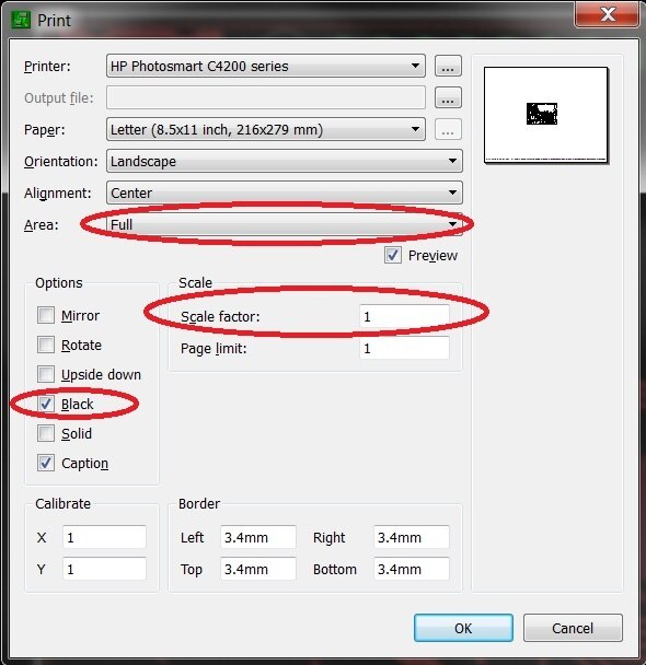 Step 2: Adjust the printer settings for a 1:1 scale, and hit 'Print'. The important settings are highlighted above. Scale factor is obvious, however the area must be 'FULL' since 'WINDOW' will result in an improperly scaled printout. Also, I prefer the 'BLACK' option to be selected since a black-and-white printout will work just fine.