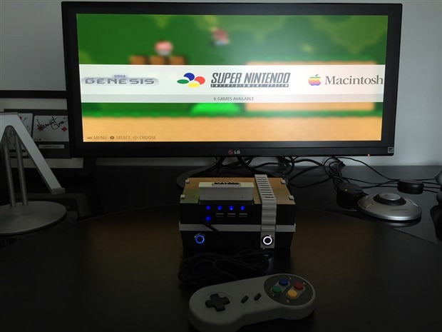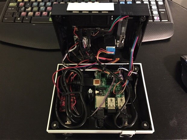 The cover opens electronically due to a stepper motor and a python script. It runs the latest version of Retropie.