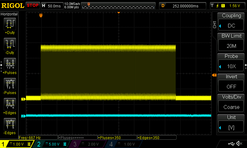 A test to see if the PIO actually generates the amount of steps that I request. In this case: 350. I've used my oscilloscope's pulse counter to do the work for me. It's a match.