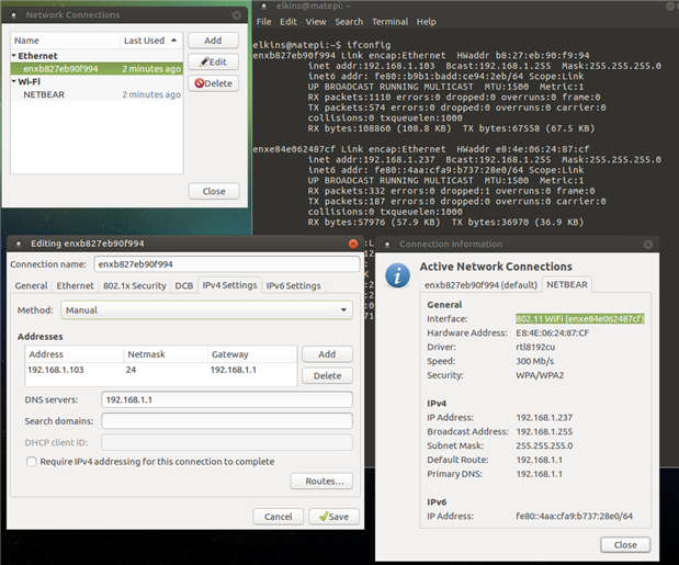 The result is the lower right hand box showing the NETBEAR tab and the `ifconfig` output in a terminal window behind the 3 boxes. You should see that the wired connection has a static IP address and the WiFi connection is using the DHCP scheme.