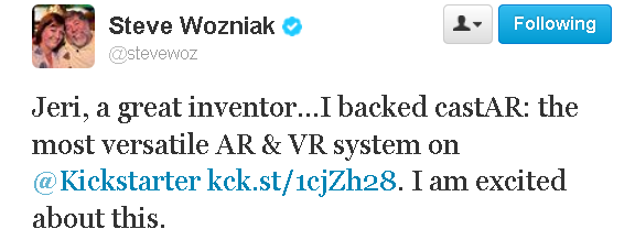 (I was also wondering how the eye/brain combination would perceive the effect of dramatically increasing the separation between the two cameras when used with CastAR --- that's sure to be interesting, as it will allow parallax to be increased artificially beyond human range.)