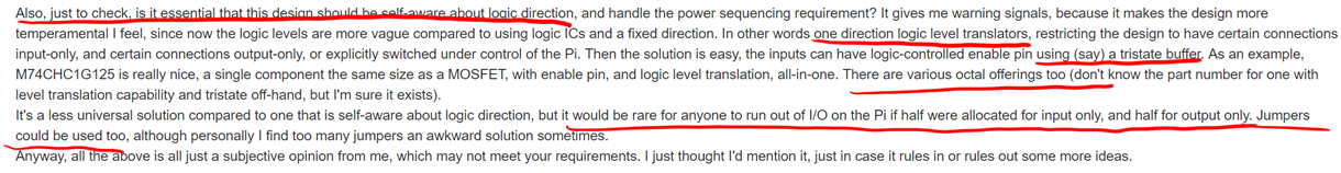 The thing you were initially asking for (something that acts like a wire in both directions but also does level conversion, with no configuration of direction, and behaving open circuit until the Pi is powered up) is not what is being discussed now.