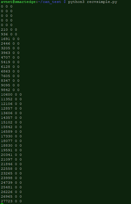ip -details -statistics link show can0 4: can0: <NOARP,UP,LOWER_UP,ECHO> mtu 16 qdisc pfifo_fast state UNKNOWN mode DEFAULT group default qlen 10 link/can promiscuity 0 can <TRIPLE-SAMPLING> state ERROR-ACTIVE restart-ms 0 bitrate 250000 sample-point 0.875 tq 250 prop-seg 6 phase-seg1 7 phase-seg2 2 sjw 1 mcp251x: tseg1 3..16 tseg2 2..8 sjw 1..4 brp 1..64 brp-inc 1 clock 8000000 re-started bus-errors arbit-lost error-warn error-pass bus-off 0 0 0 0 0 0 numtxqueues 1 numrxqueues 1 gso_max_size 65536 gso_max_segs 65535 RX: bytes packets errors dropped overrun mcast 17224264 2153033 0 1508 0 0 TX: bytes packets errors dropped carrier collsns 16 2 0 0 0 0