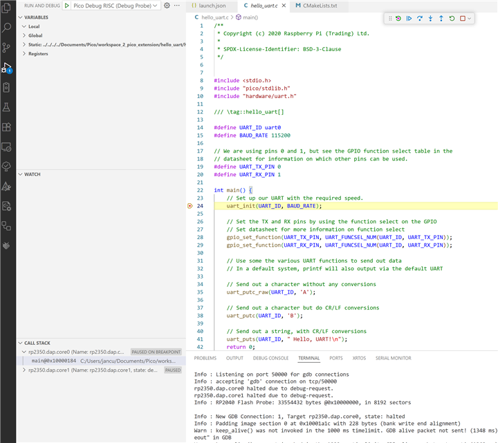 edit: solution: RE: have you debugged a Pico2 RISC program with a PICOPROBE / DEBUGPROBE?