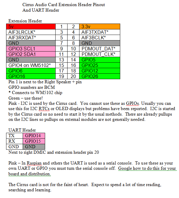 The Cirrus card has a 20 pin extension header and a three pin UART header that give access to RPI GPIOs, I2C and UART.
