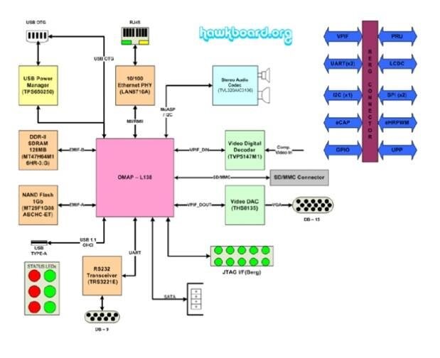 For starters, I have been reading anything I can about this board in order to familiarize myself with it. Below, is a block diagram from the schematics which I found useful as an overview of the Hawkboard. As you can see, it includes just about every interface under the sun … tons of I/O!