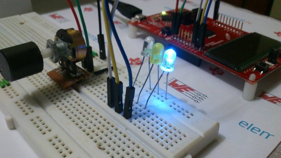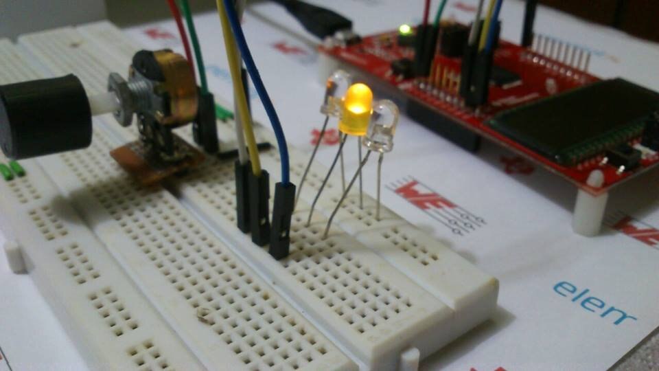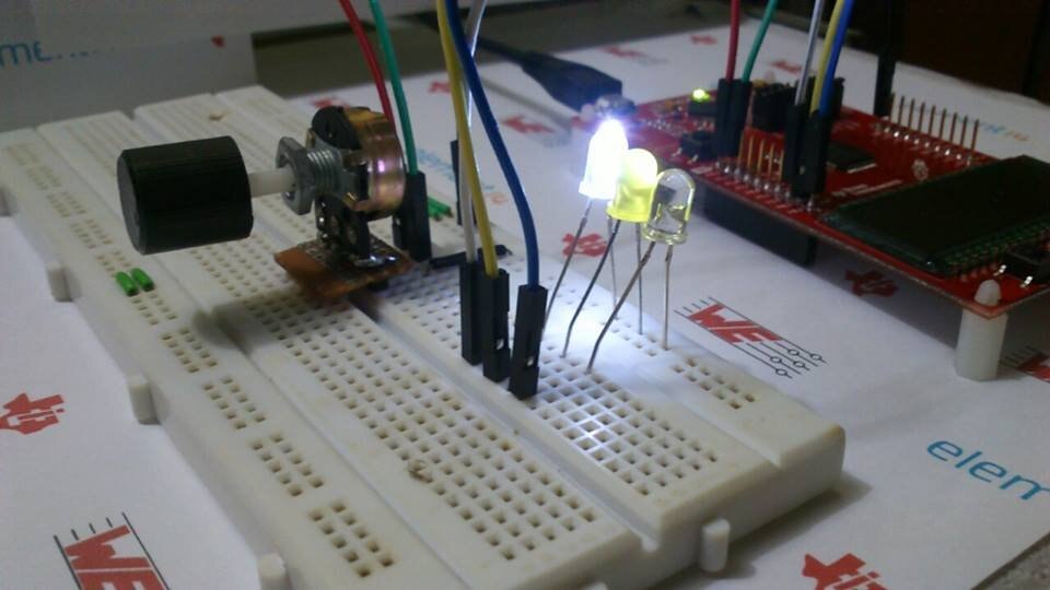 The idea is, using potentiometer to input various level of range voltage input to ADC channel and switch three LEDs accordingly on/off, which is exactly my Smart Vehicle Headlight idea.