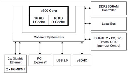 - e300 (MPC603e-based) core, which includes 16 Kbytes of L1 instruction and data caches, a floating point unit, and performance monitor
