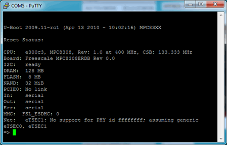 Подключив USB-RS232 к первому порту MPC8308-RDB и настроив терминал 115200-8N1 включаем роутер. Ничего страшного не произошло. Засветился D17 означающий наличие +5VSB. Еще раз взглянув на переднюю панель нашел кнопку включения. Нажали и увидели как включились D18 +3,3V, D16 +5V, D12. При подключении кабеля к порту ENET0 включатся D6 — Duplex, D7 — Rx, если у вас сеть 100Mb, то включится D5, если 10Mb — D4.
