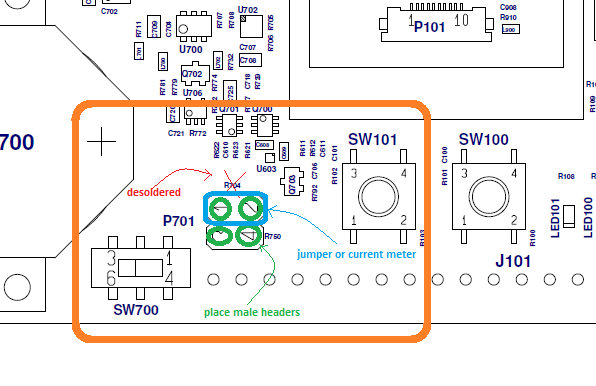 I monitor the current with the Energy Profiler and with a µCurrent. To be able to measure current, I desoldered R704 and populated P701 with male print headers.
