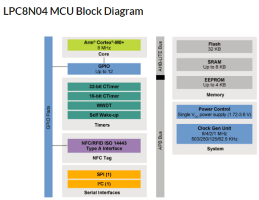 It's produced by NXP, and called the LPC8N04 microcontroller.They consider it an entry-level connectivity solution for embedded applications with integrated NFC connectivity. It contains multiple features, including several power-down modes and a selectable CPU frequency of up to 8 MHz for ultra-low power consumption. The peripheral complement includes 32 kB of flash memory, 8 kB of SRAM, 4 kB of EEPROM, one I2C, one SPI/SSP, and up to 12 general purpose I/O pins. Your can read more about it by clicking here.image