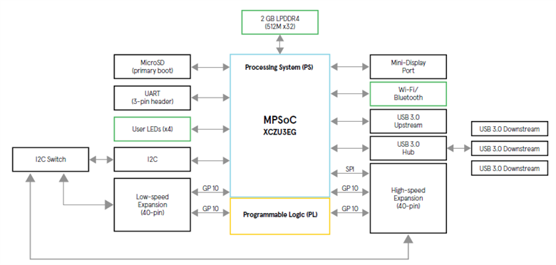 MPSoC development board based on the Linaro 96Boards specification. The 96Boards’ specifications are open and define a standard board layout for development platforms that can be used by software application, hardware device, kernel, and other system software developers.