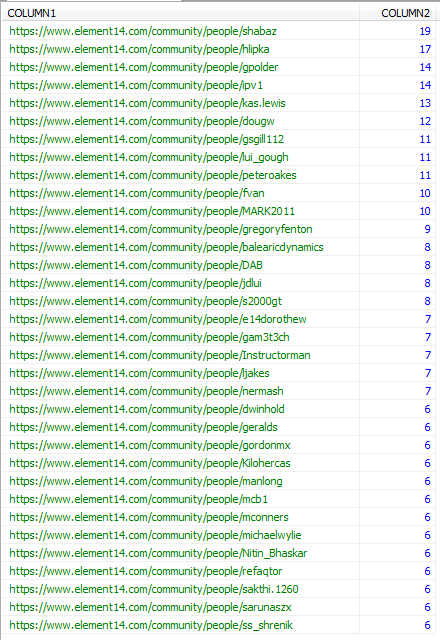 So I don't think it's a surprise to see the names that you do, nor do I think it's a big surprise that of many of the RoadTesters have only done one or two tests. What is more interesting is to think the sheer number of items element14 have generously shipped out to all reviewers combined ... and the cost that must have entailed.
