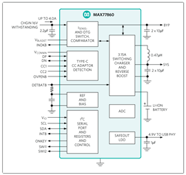 The USB-OTG output provides true-load disconnect and is protected by an adjustable output current limit. It has an input current limit up to 4.0A and can charge a single-cell battery up to 3.15A. When configured in reverse-boost mode, the IC requires no additional inductors to power USB-OTG accessories. The on-chip ADC can help monitor the charging input voltage/current, battery voltage, charging/discharging current, and the battery temperature. For More Info about the MAX77860For More Info about the MAX77860