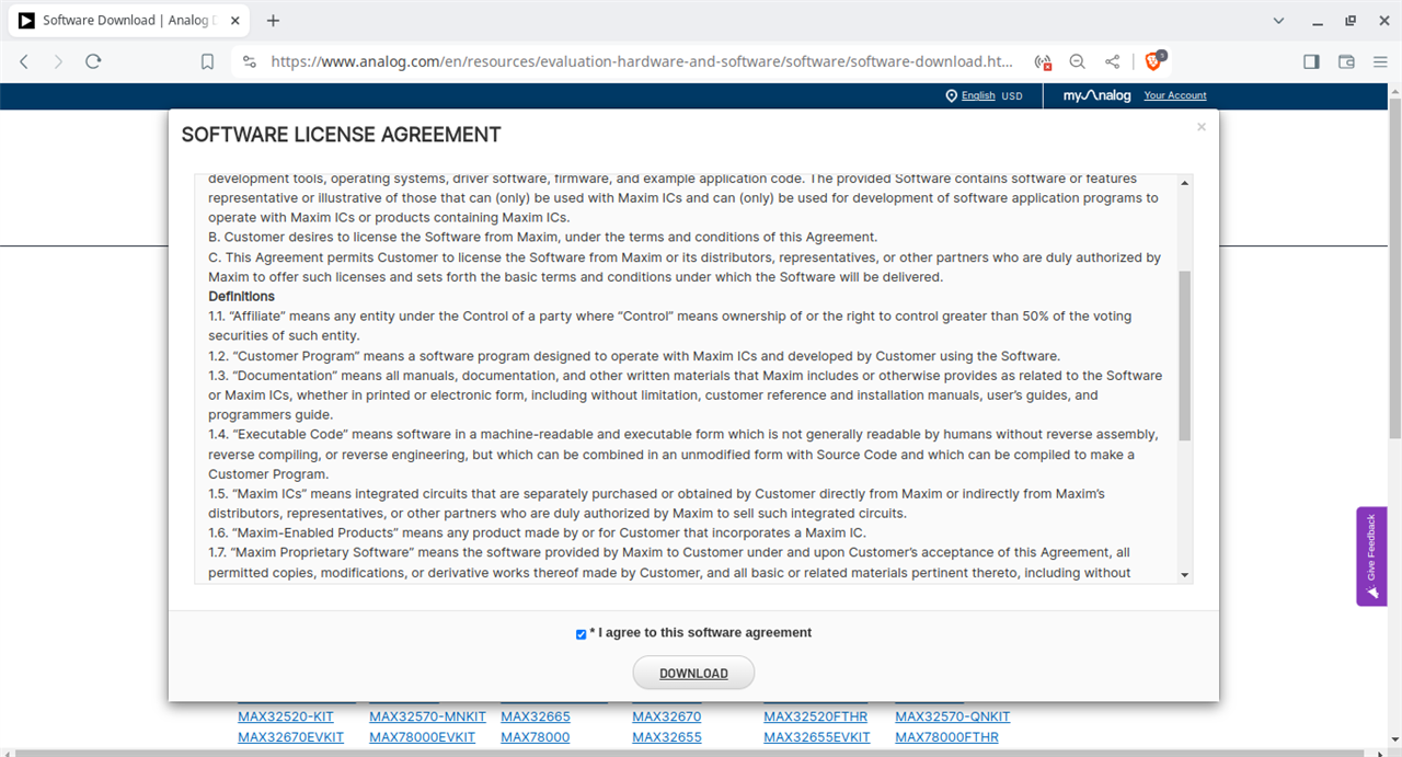 To download software, pls click and go here, and then scroll to 'Tools & Simulations', and choose correct sofware 'Maxim Micros SDK (Windows), 1.0.1', according to operating system