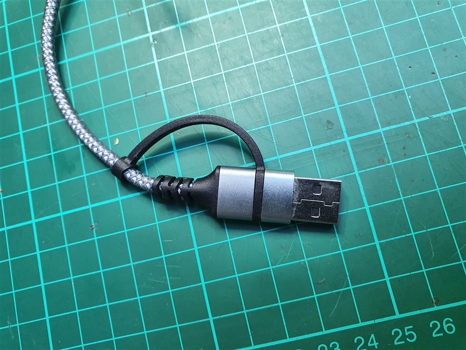 This cable is there to connect the R4 to the host computer. As it is braided, it should be more durable than the standard ones. Also, it quite cleverly contains an embedded A to C adapter on one end, catering for both computers that only have USB-C or more ancient USB-A plugs.