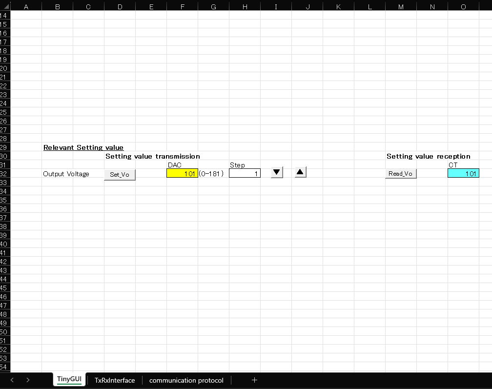 The port number shown in the device manager should match with the one shown in Worksheet 2 TxRxInterface. Once this is confirmed Go back to Worksheet 1 TinyGUI to set the output voltage. By referring to the manual, we know that the Vo of the buck converter is determined by the code of D/A converter and the following equation is established.