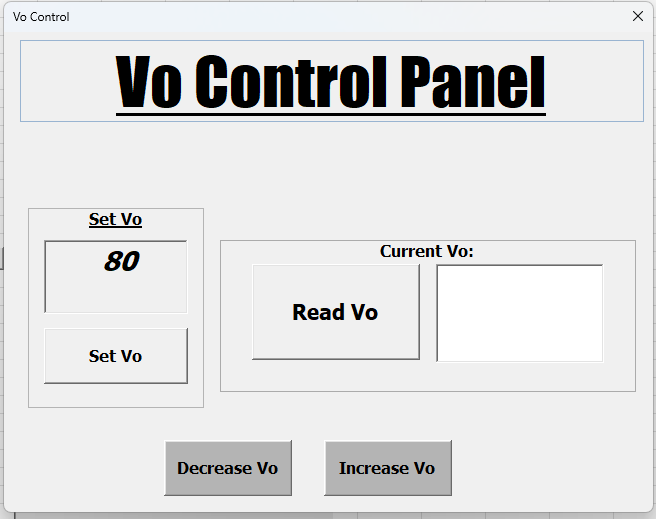 Basically what does the GUI does is that, it takes the value in the form D/A code and convert it to the desired voltage. The code for this GUI as shown belowPrivate Sub btnSetVo_Click()