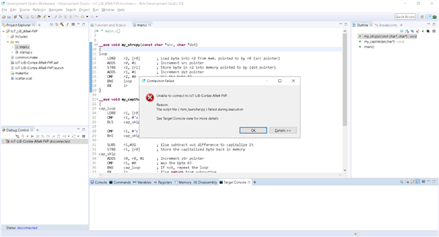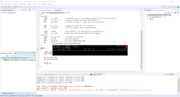 We return to assembly programming in Lab 8, this time debugging an emulated Cortex-A9 processor using Arm Development Studio. No coding exercise here, just importing an existing project so that I can step through the disassembly. I hit an obstacle here as I wasn't unable to connect to the emulated processor. I did not foresee this gotcha, having followed every step along the way. I thought this might have been caused by a missing emulator on my system, as mentioned on Stackoverflow. I promptly went to sign up for an evaluation on Arm Fixed Virtual Platforms, which did me no good at all.