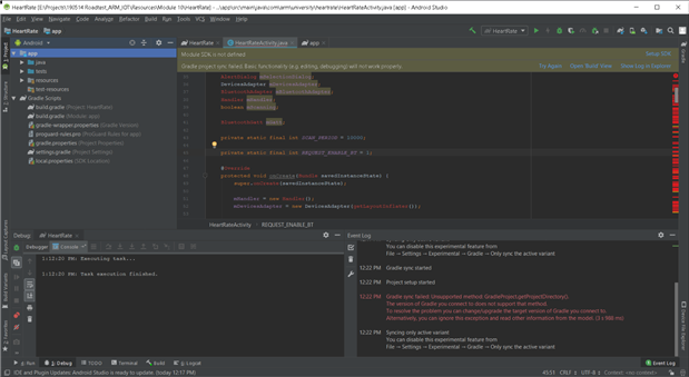 This exercise builds an Android app which connects to a BLE Heart Rate Sensor. Remember the dodgy outdated project files I've encountered in Lab 9? Turns out I wasn't able to import this project either. I'll spare you to hours of frustrations that i have to go through, installing and uninstalling tools, modifying gradle project files settings, and lots of superstitious exiting and re-starting Android Studio. Moving on.
