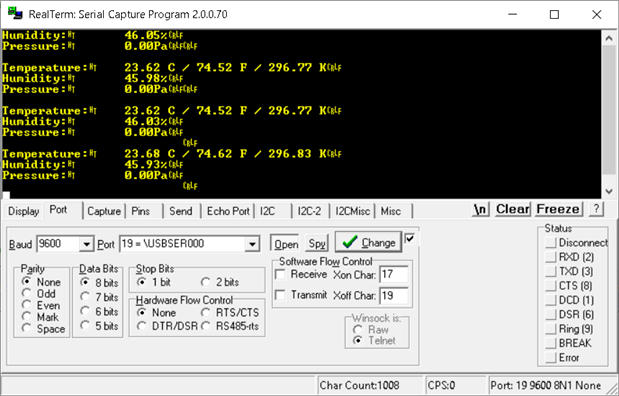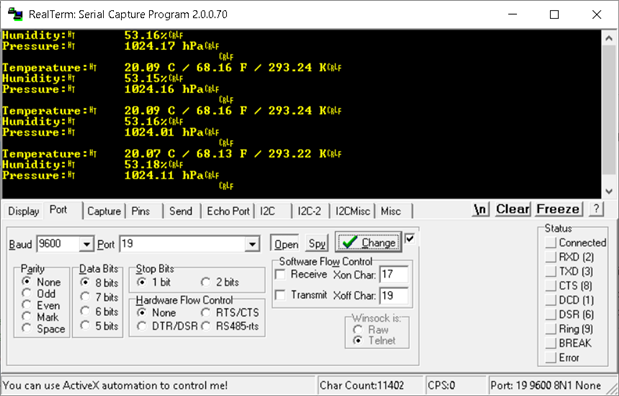 The drivers to communicate with both sensors are already provided, so this is a pretty easy exercise. As luck would have it - I was able to build and flash the the dev board without any hiccups. However, when I turn on my Serial Terminal I noticed that the pressure reading was 0.00Pa. My dev board wasn't reading from LPS22HB.