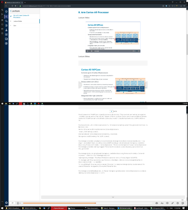 Module 8 covers the Cortex-A9 Processor architecture: Pipeline, multi-core processing, virtual registers, memory system, etc. Throughout the video, I kept wondering if these information is related to the lab exercises at all. I must say that after Module 8, I feel better equipped to answer the quiz back in the previous module. Maybe there was a mix-up some where. Below are some slides to give you an idea of what I was staring at.
