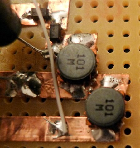 Here is a pic of the tape method. It's not pretty (I was in a hurry). You can see two SMD inductors, and a couple of SMD diodes near the top. This was done on the plain side of normal stripboard, so it can be combined with normal wired components. The white wire is the tefzel/kynar wire mentioned earlier. If you want to use surface-mount ICs, you could glue an SMD adapter board on the plain side of stripboard too. And run the copper tape power planes three-dimensionally, from the surface of the stripboard and on to the
