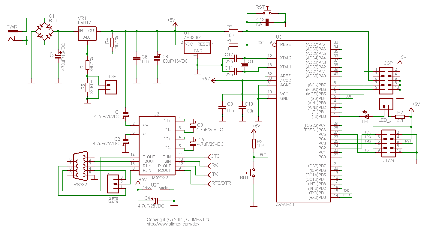 - JTAG 5x2 pin connector for in-circuit programming and debugging with AVR-JTAG-USB and AVR-JTAG-L