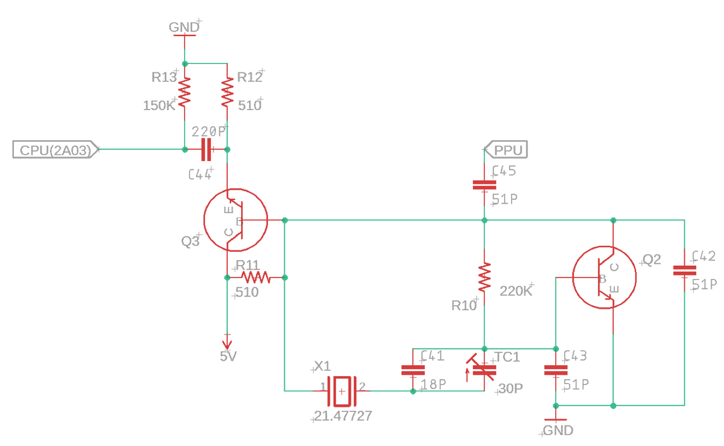 I'm specifically worried about the XTAL clock. Its based on StandaloneNesPlayer (soniktech.com) but I don't have a 74HCT04N so I figured I'd use a transistor for the not gate but my R2 value of 10k is arbitrary.