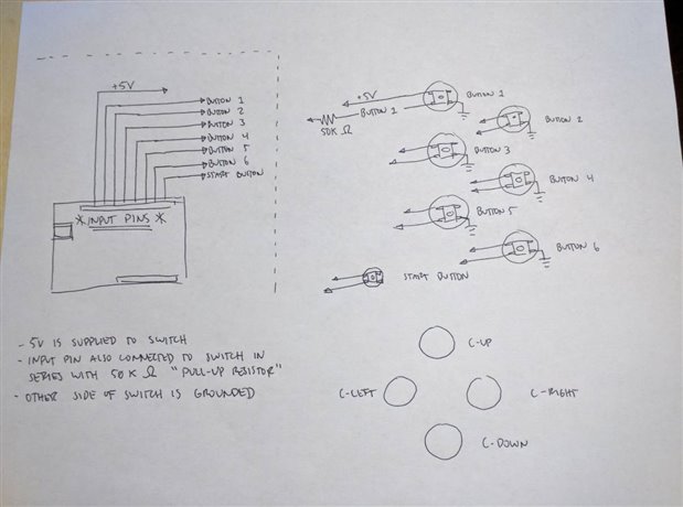 I hope this drawing isnt confusing, I only actually filled in how Button 1 will work, but the rest of the buttons will be wired and will work the exact same way. As for the joysticks, they will be a bit different so I figured we'll wait on those.