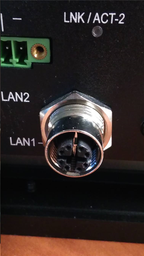 I think this is a female M12 conector of 8 pins X coded, but I cannot find the cable that I'd need it to connect to my PC.