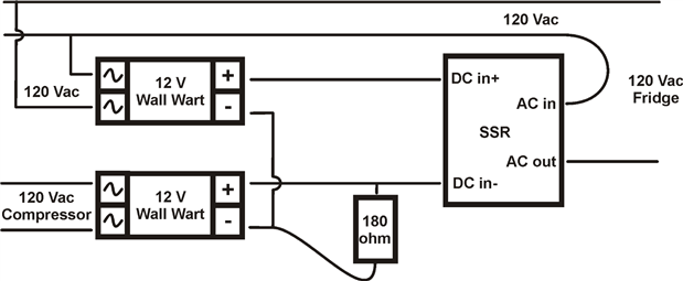 The lower wall wart is powered when the compressor is powered. If both wall warts are on - the SSR is off.