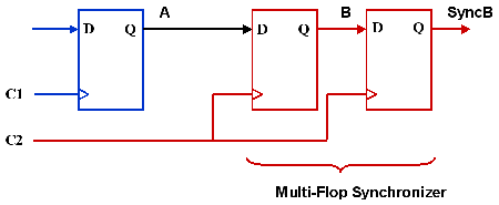This synchronizer circuit is made of an input flip-flop synchronized in the input clock domain and a set of two flip-flop synchronized in the output clock domain.